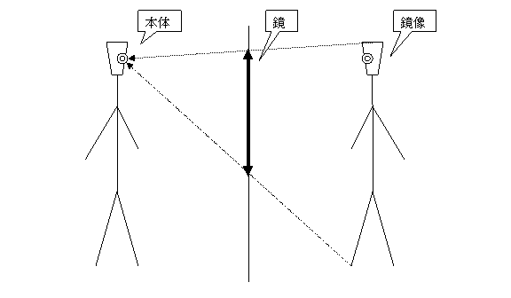 図に示したように、本体を鏡に映すと、本体と同じ大きさの鏡像が、鏡の平面のちょ うど反対側にできます。その像を、鏡を透して観るわけですから、比例関係から鏡は太い矢印でしめした半分の長さでよ いわけです。たても横も半分でよいので、面積にしたら4分の1でよいわけです。光が 通ってこない矢印から外の分は必要ないことになります。ただし、太い矢印の部分が 欠けていたら、そこを透る分は観ることができません。